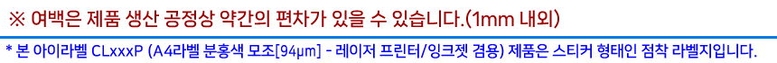 ![]() ※ 라벨 칸 수가 같아도 라벨 크기나 모양이 다를 수 있으므로 선택시 주의하시기 바랍니다. - 아이라벨 CLxxxP 분홍색 모조 - 크기순 분류 A4 - 비트몰 아이라벨 크기순 [0~5칸] [6~10칸] [11~20칸] [21~30칸] [32~50칸] [51~70칸] [71~100칸] [101~560칸] 모델번호순 - 아이라벨 CLxxxP 분홍색 모조 - 모델번호별 분류 - 비트몰 아이라벨